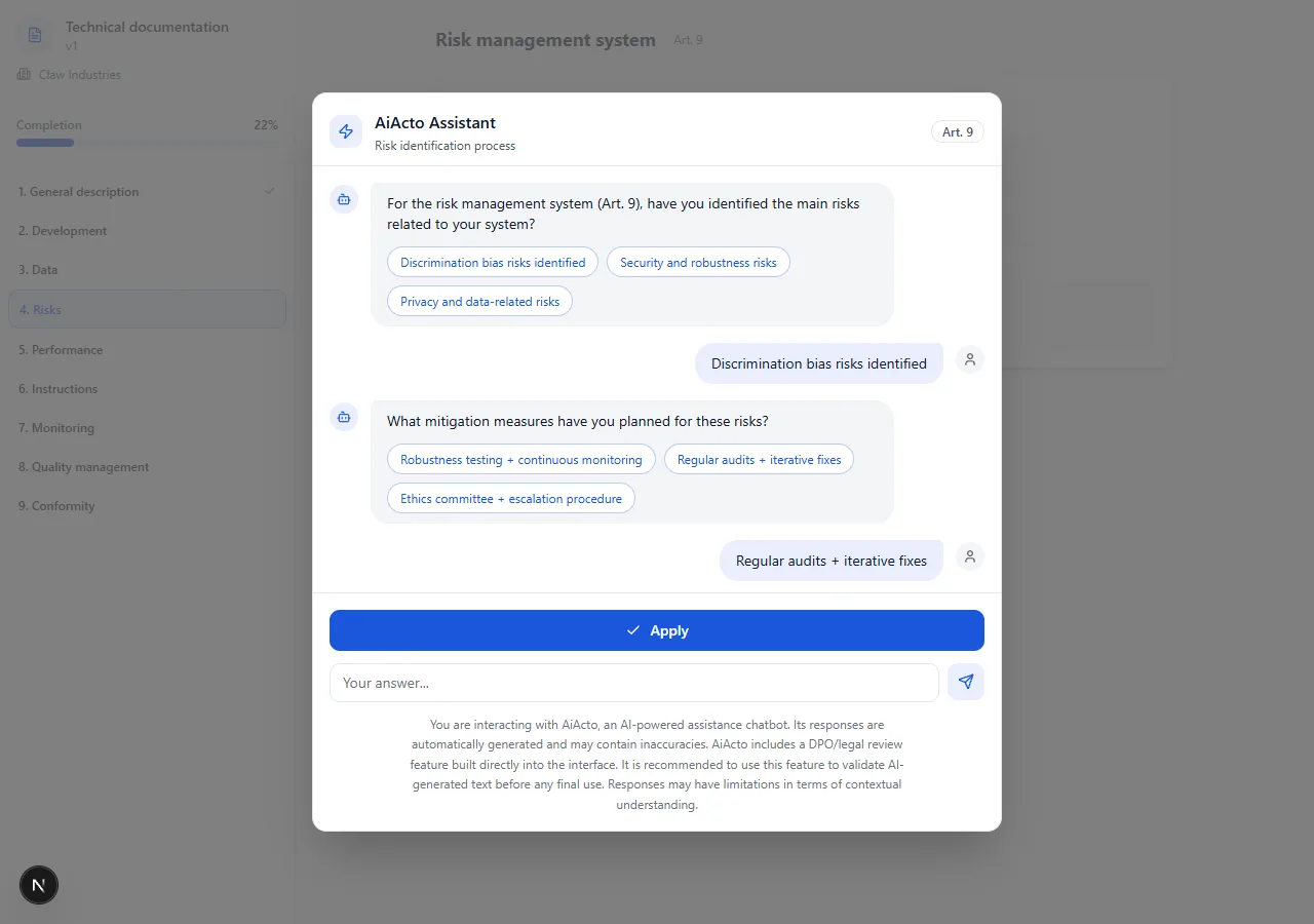 The AI Expert prepares structured drafts from your responses. Every document must be reviewed, adjusted, and validated by a qualified person before publication.