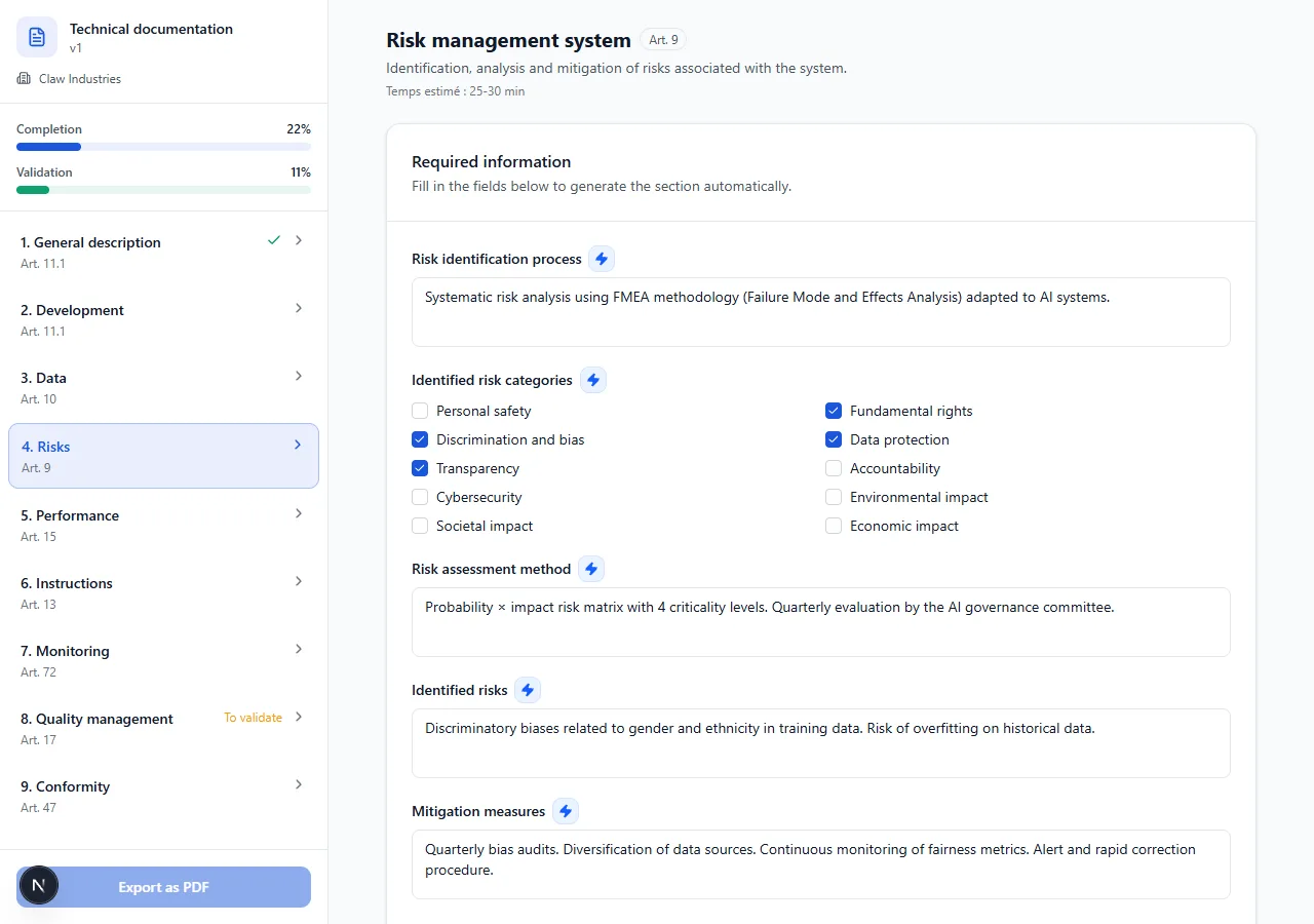 Identify your obligations in 3 minutes with a free diagnostic. Write your compliant documentation step by step with AI-guided assistance, including review, validation and audit-ready PDF export.