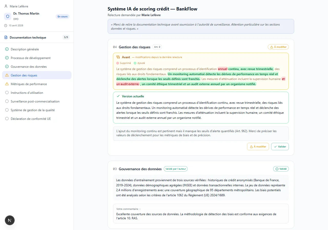 El cumplimiento del AI Act implica a expertos jurídicos, técnicos y de negocio. El módulo de revisión de AiActo orquesta la validación de su documentación técnica con flujos de trabajo estructurados.