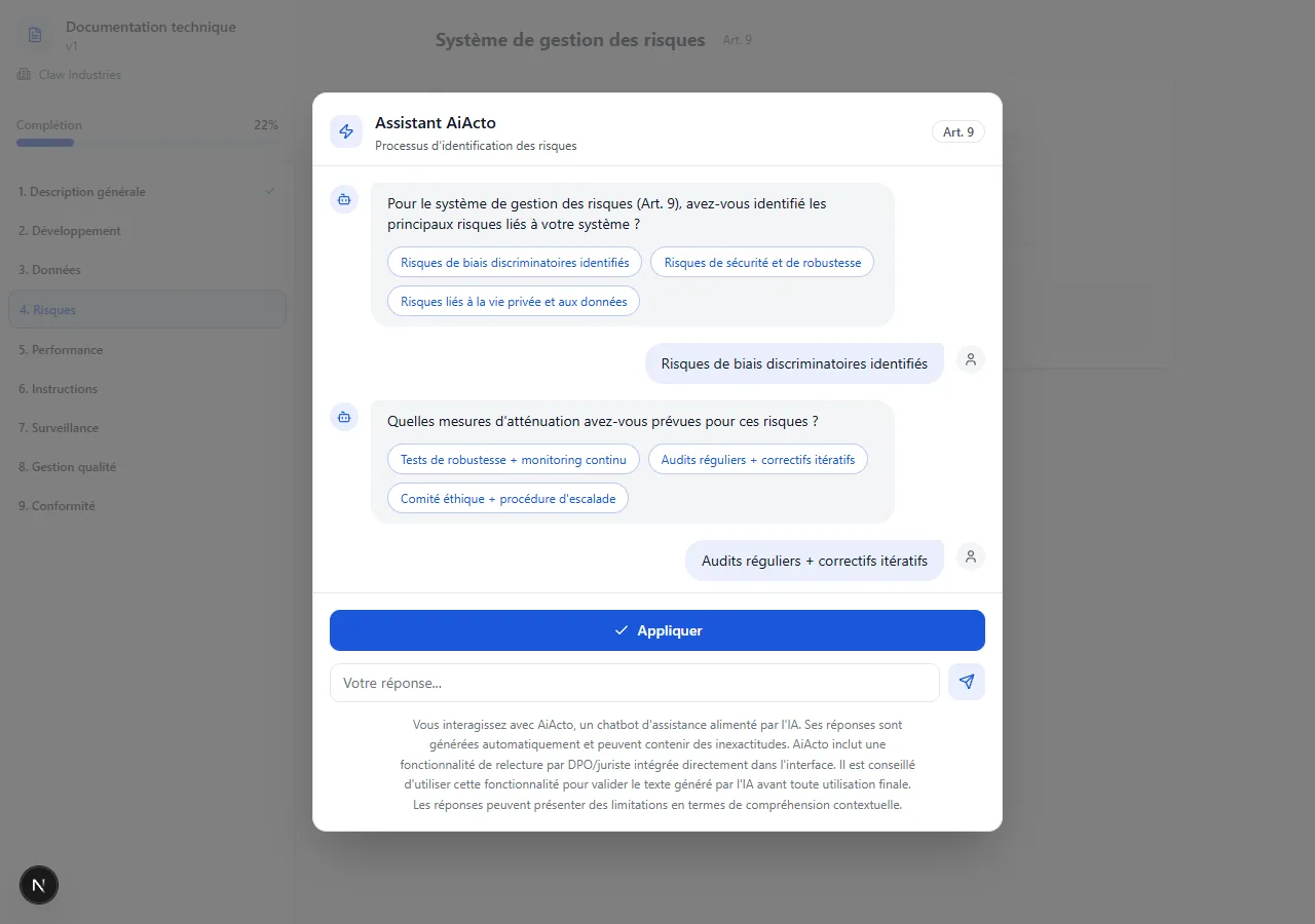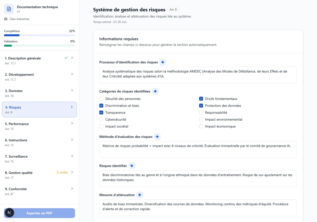 - Documentation technique conforme Annexe IV générée par IA, section par section.