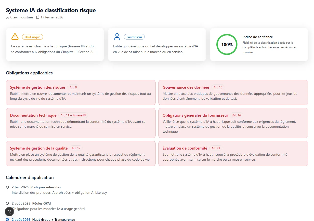 Répondez à une douzaine de questions sur votre système IA. Obtenez votre niveau de risque, votre rôle réglementaire et la liste exacte de vos obligations.